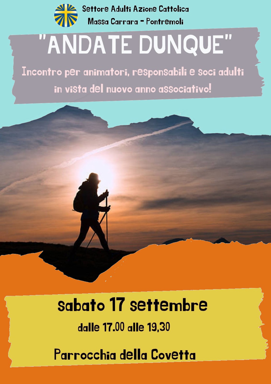 Per questo motivo ci chiediamo di partecipare sabato 17 settembre alle 17,00 all’incontro “Andate dunque” per gli animatori, i responsabili e i soci adulti della nostra associazione. L’incontro si terrà presso la parrocchia della Covetta e terminerà verso le 19,30.