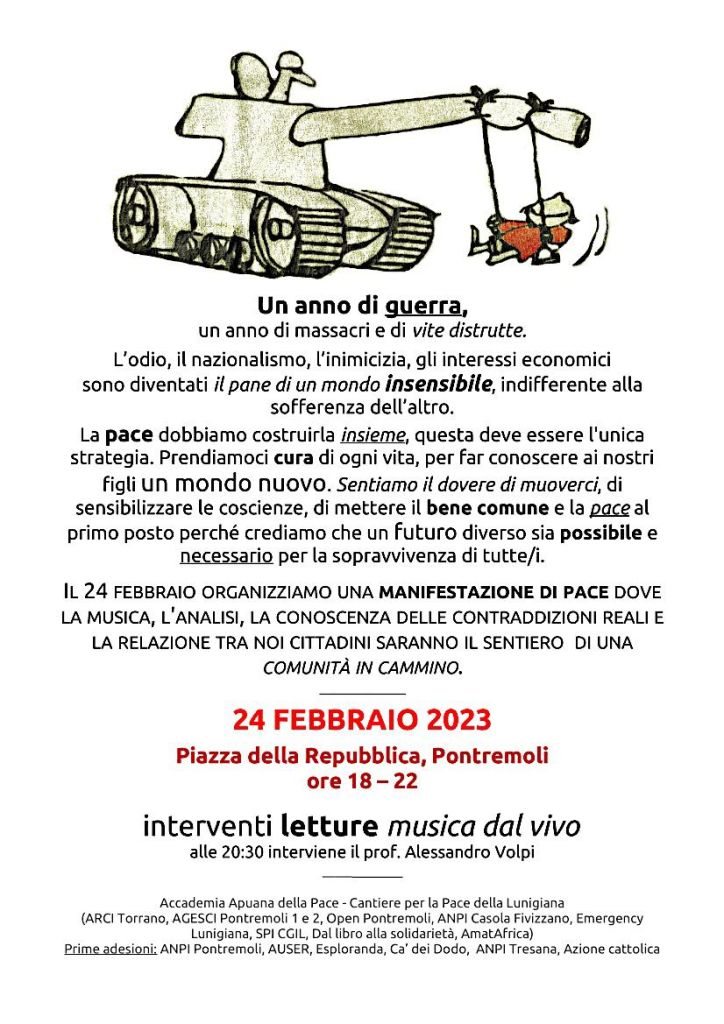 A Pontremoli, alle dalle ore 18 alle ore 22 in piazza della Repubblica con interventi, letture e musica dal vivo.