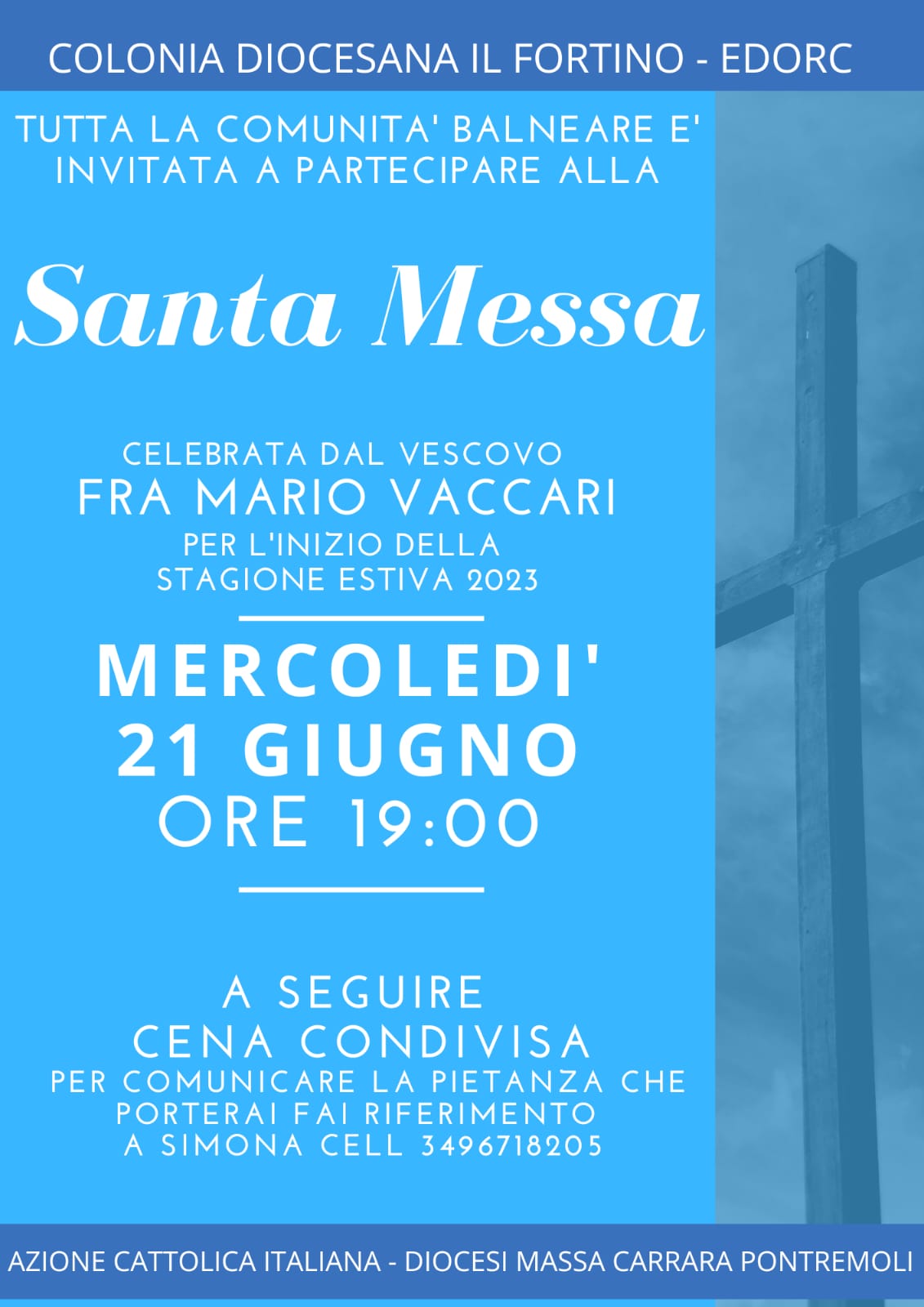Come ogni inizio di stagione estiva alla Colonia Diocesana il Fortino verrà celebrata la Santa Messa presieduta dal nostro Vescovo Fra Mario Vaccari e concelebrata dal nostro Assistente Generale Don Tommaso.