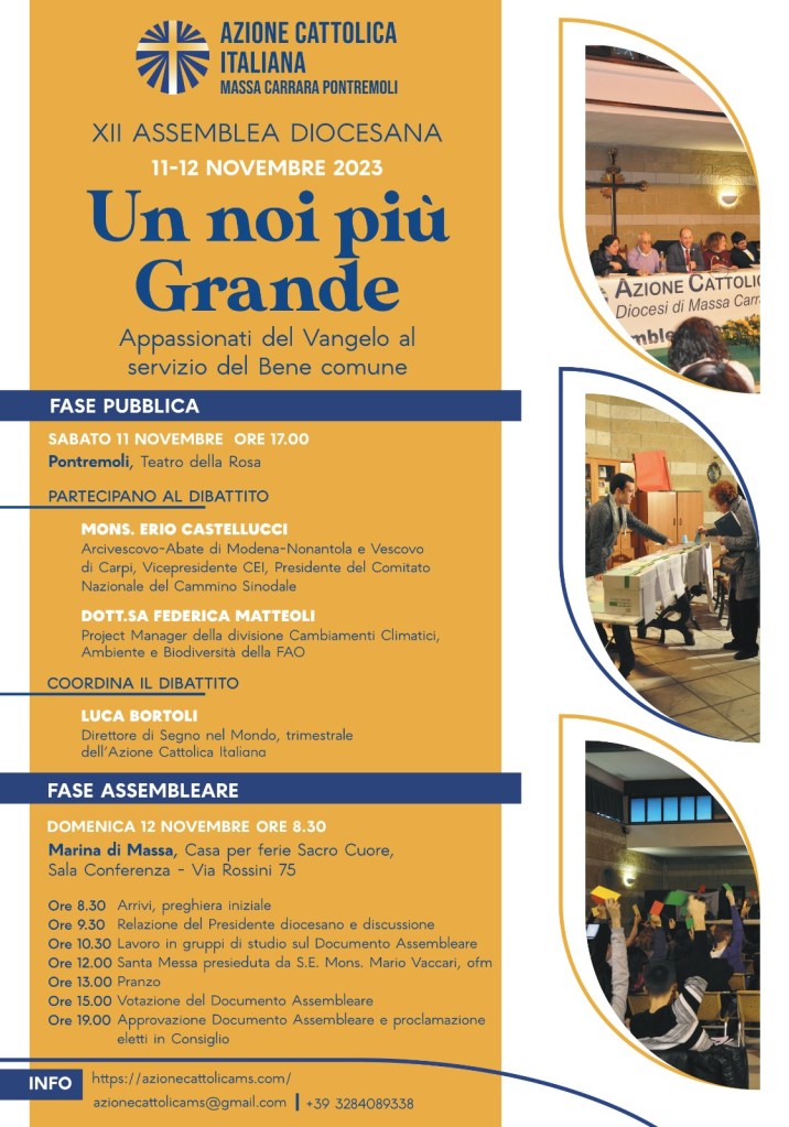 –Sabato 11 Novembre alle ore 17, a Pontremoli presso il Teatro della Rosa si svolgerà il momento pubblico al quale parteciperanno Mons. Erio Castellucci, Vescovo di Modena-Nonantola e di Carpi, vice Presidente della CEI e Presidente del Comitato Nazionale del Cammino Sinodale, insieme alla dott.sa Federica Matteoli, Project Manager della divisione Cambiamenti Climatici, Ambiente e Biodiversità della FAO. Il dibattito, coordinato da Luca Bortoli, direttore di Segno nel Mondo, verterà sul tema dell’impegno laicale alla luce del titolo dell’assemblea.