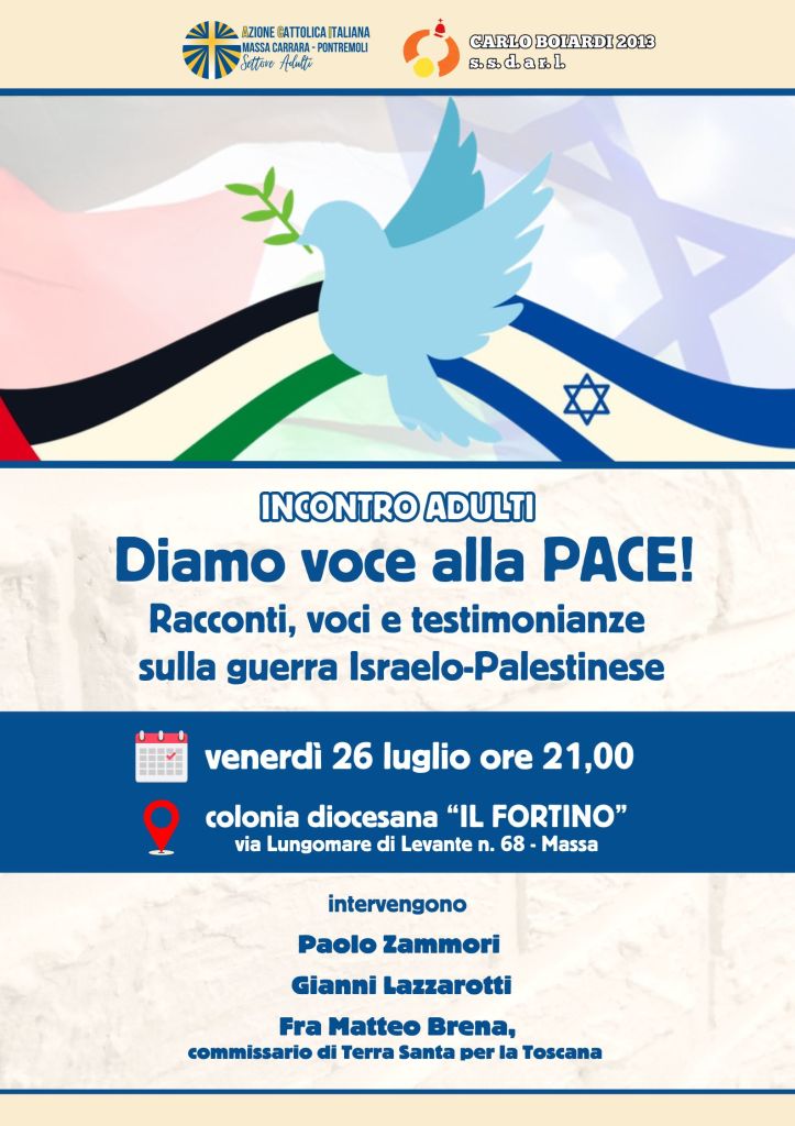 Il Settore Adulti di Azione Cattolica alla Colonia Il Fortino a Marina di Massa venerdì 26 luglio alle ore 21, ha organizzato un incontro sul tema della Pace dal titolo “Diamo voce alla Pace – Racconti, voci e testimonianze sulla guerra Israelo-Palestinese”. Ospiti della serata saranno Gianni Lazzarotti, che ha partecipato al pellegrinaggio in Terra Santa organizzato da alcune parrocchie diocesane poche settimane prima dello scoppio della nuova fase della guerra successiva al 7 ottobre 2023, Paolo Zammori, pacifista che ha partecipato al Pellegrinaggio della Diocesi di Bologna in Terra Santa con il Cardinal Zuppi nel corso del quale hanno incontrato le varie realtà coinvolte nel conflitto, e Fra Matteo Brena, Francescano e Commissario di Terra Santa per la Toscana.