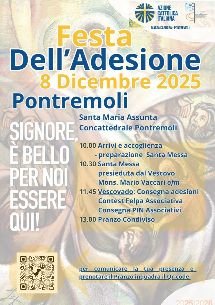 Ecco la locandina della Festa dell’Adesione che si terrà lunedì 8 dicembre 2025 presso la Concattedrale di Pontremoli Santa Maria Assunta. Vi aspettiamo!