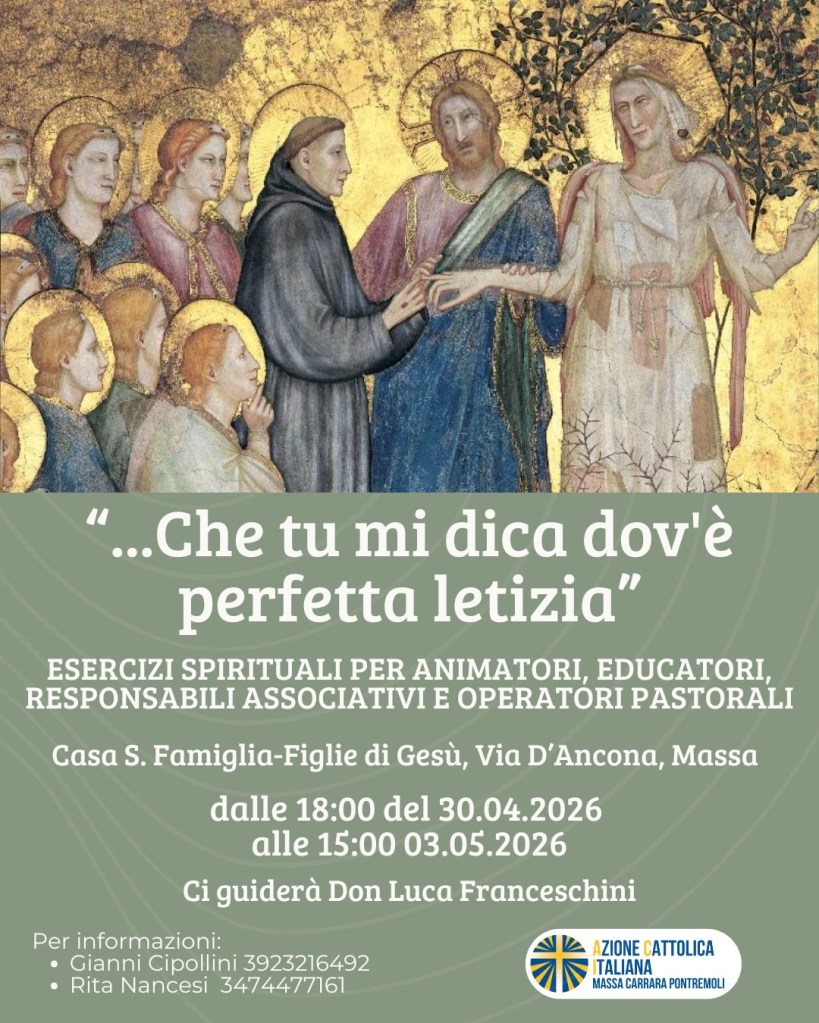 siamo lieti di invitarti a partecipare agli Esercizi Spirituali, appuntamento annuale che la nostra associazione raccomanda a tutti coloro che svolgono un servizio educativo o ricoprono, a vario titolo, un ruolo di responsabilità pastorale.